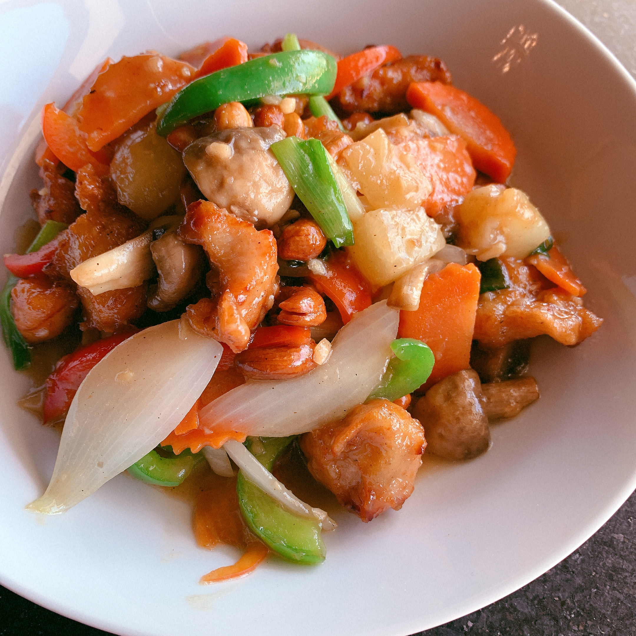 Crispy pork , Thai BBQ pork, sweet sausage and boiled egg over rice with sweet red sauce and served with clear soup on the side.