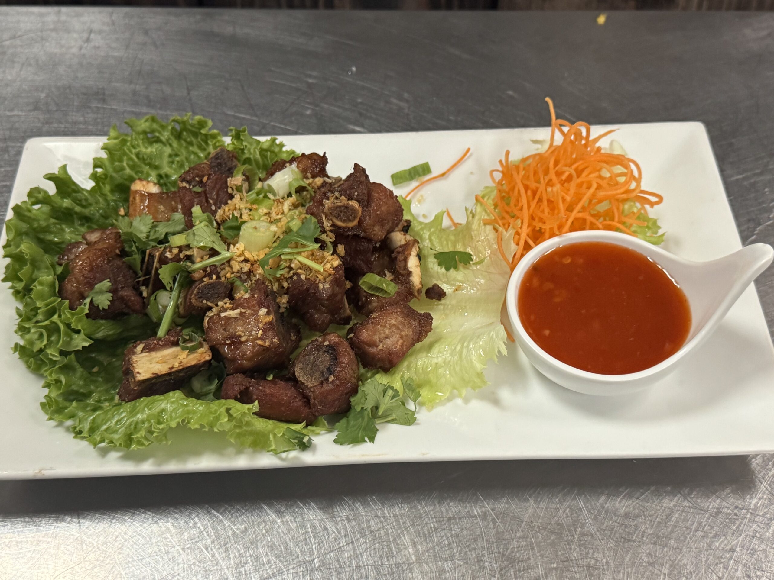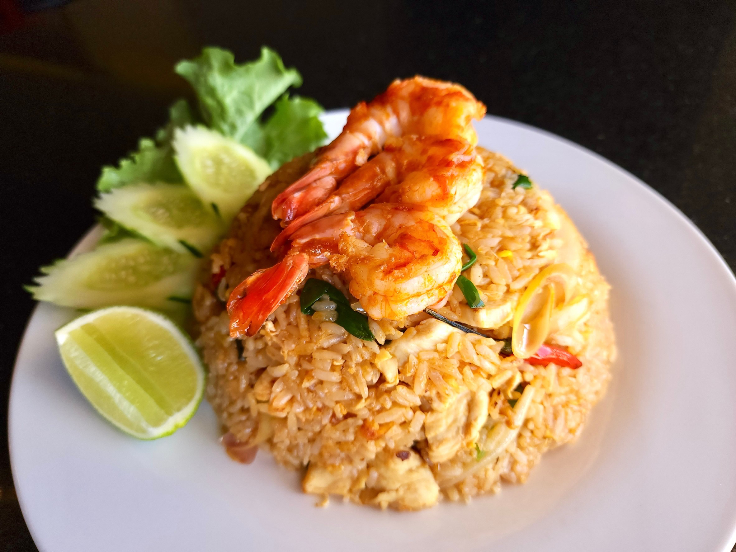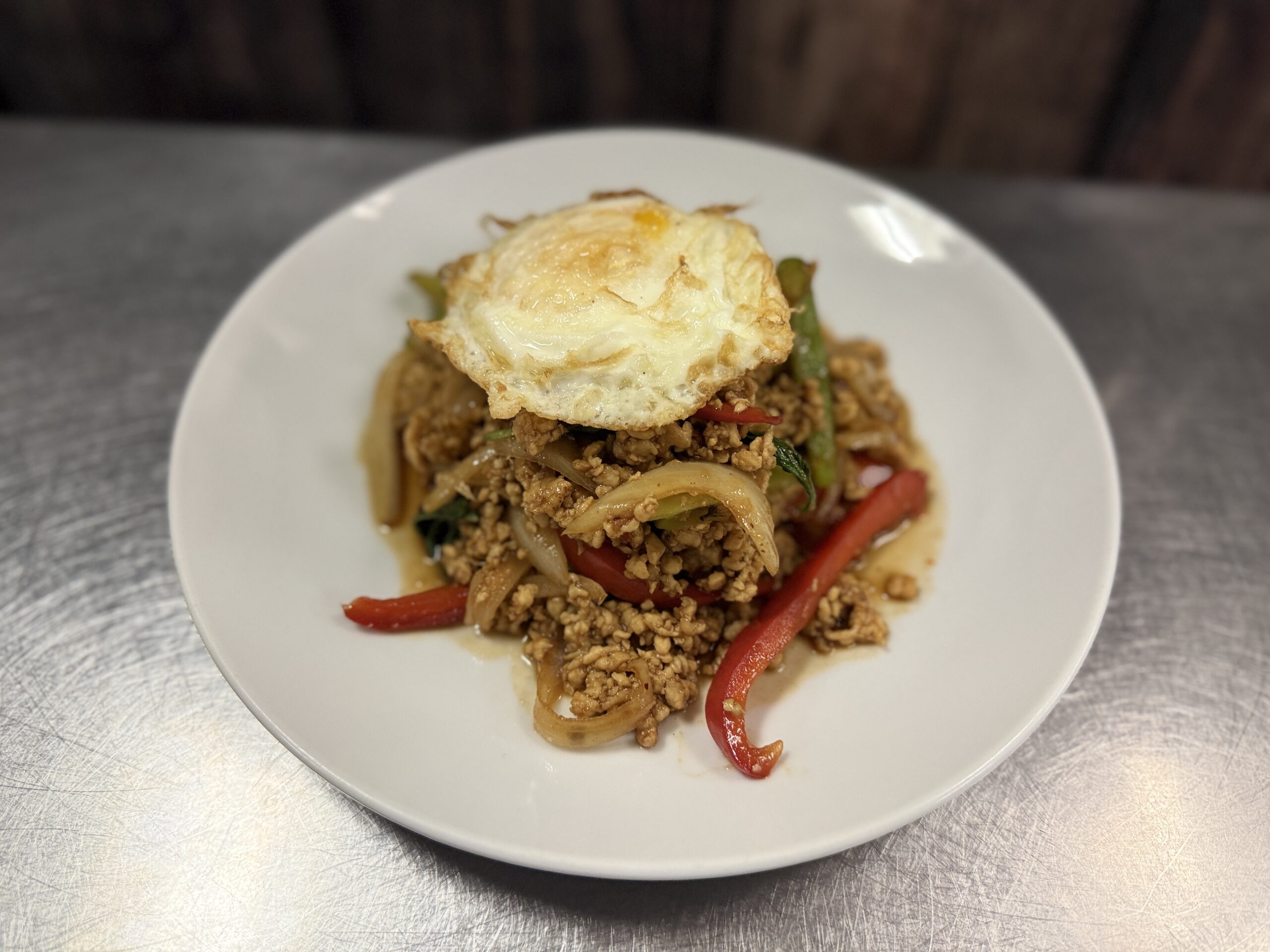 Wok fried wide flat noodles with chicken and egg. Served over a bed of green leaf lettuce, topped with scallions, with a side of the original Thai sweet sriracha sauce.