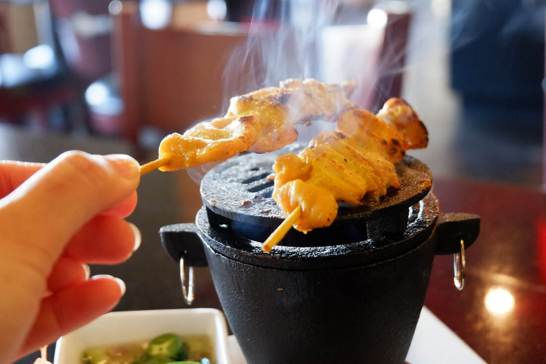 Grilled marinated pork, skewers served with sticky rice, dry Thai chili sauce.