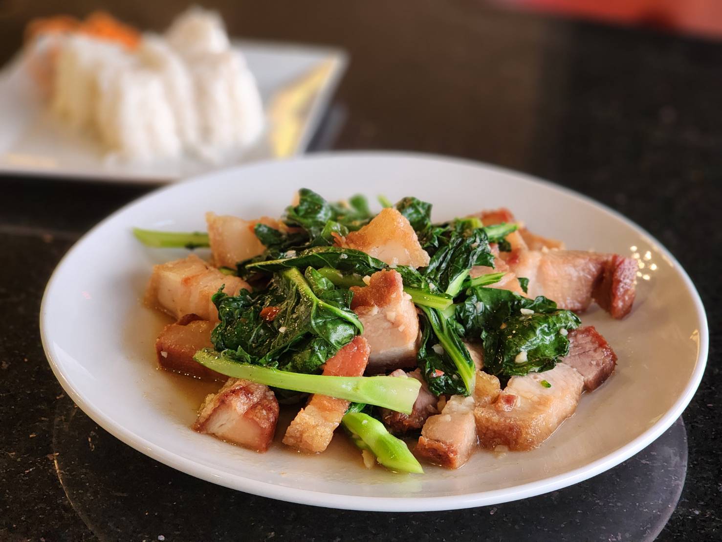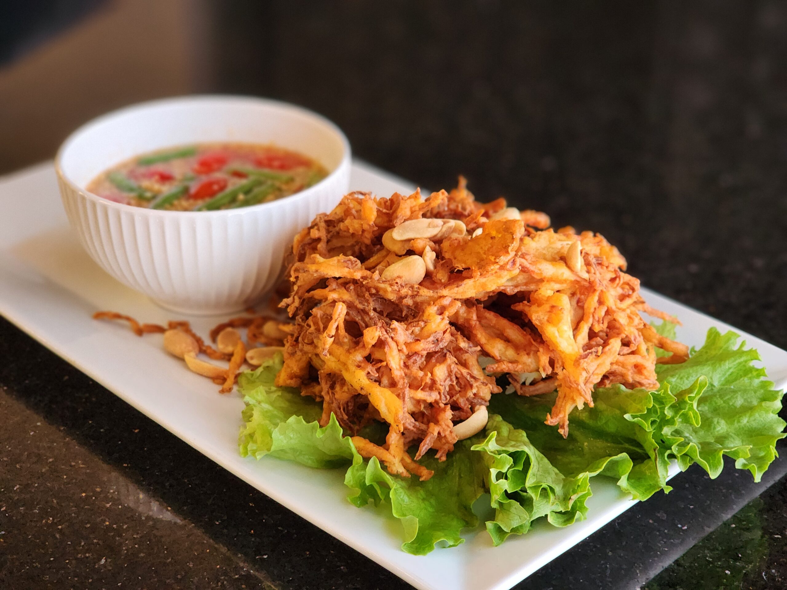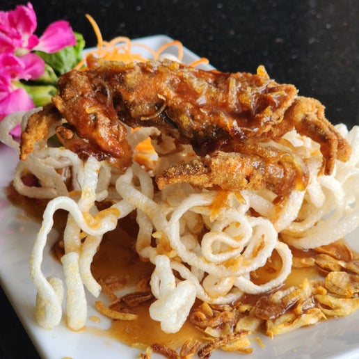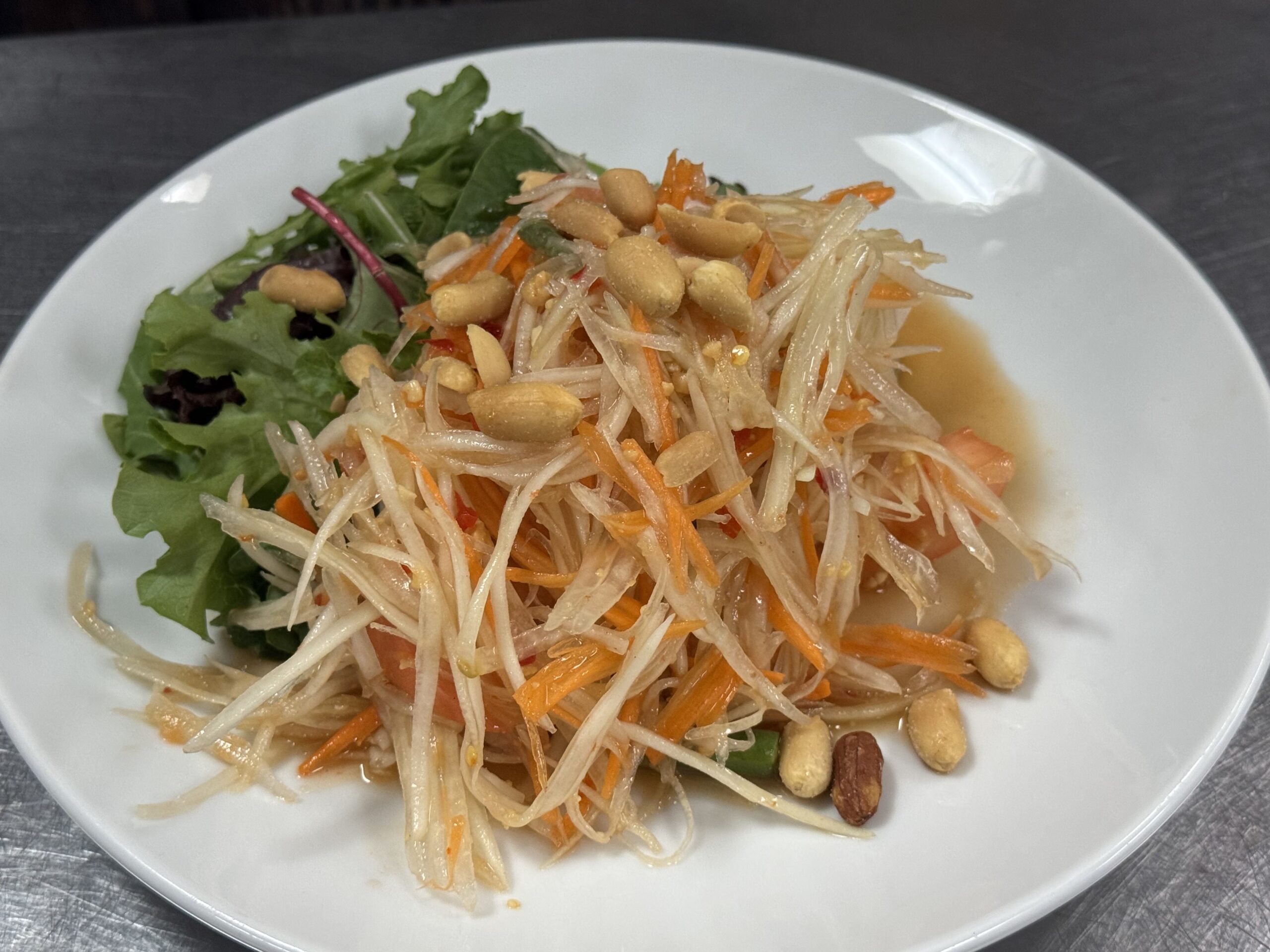 Fried shredded green papaya, carrot, green bean mixed with peanuts, tomatoes, garlic.